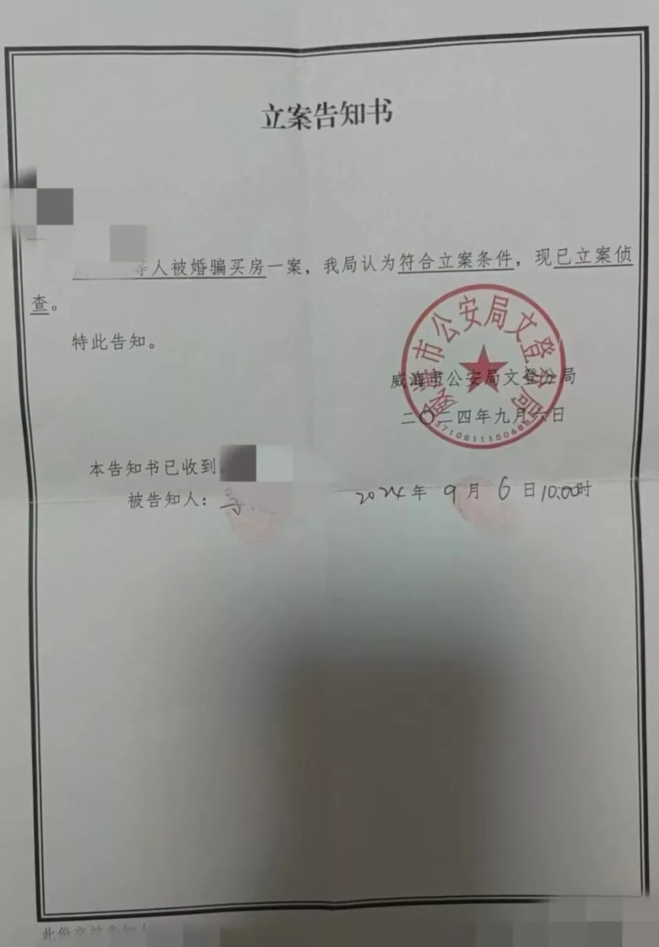 一份威海公安局文登分局(以下简称“文登分局”)出具的立案告知书显示,2024年9月女性们被婚骗买房案已立案调查。