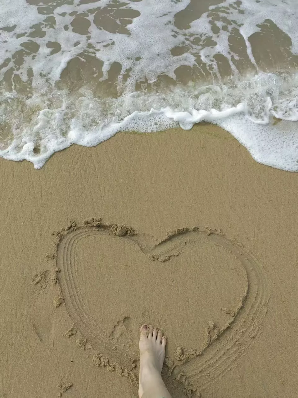 2023年7月,吴传莉在威海的海边沙滩画了一个爱心。受访者供图