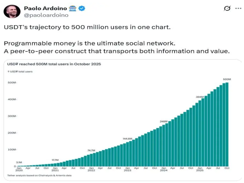 Tether首席执行官Paolo Ardoino 10月22日表示,其“真实用户”数量已超过5亿,这一数字相当于全球约6.25%的人口。