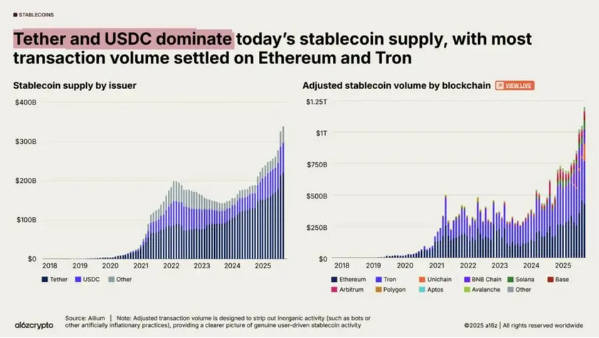最新数据显示,在 2025 年初,Tron 和 Ethereum 两条链合计就约占 USDT 总流通量的 90%。其中 Tron 约 50 %,Ethereum 约 40 %。