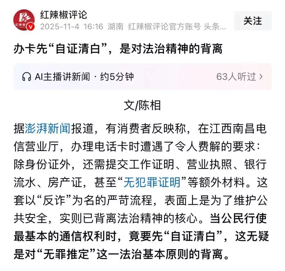 我听说,现在办银行卡、电话卡,更是难上加难!根据澎湃新闻11月3日的报道,多地办电话卡需要工作证明、无犯罪记录、银行流水等。理由还是冠冕堂皇的反诈。意思是有过犯罪记录的人,连手机也不能用了?为此,有媒体评论,办卡先“自证清白”,是对法治精神的背离。