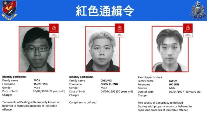 港警在JPEX加密货币骗案中控告 16人,并通过国际刑警组织向三名在逃主脑发出红色通缉令,三人由左至右分别是莫浚廷丶张骏晴及郭浩麟。 © 警方记者会直播截图(麦燕庭提供)