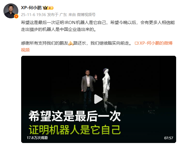 在“2025小鹏科技日”上,小鹏全新一代IRON亮相,并展示了猫步般轻盈的步态。随后,有不少网友质疑,称“感觉是个真人在努力扮演机器人”。