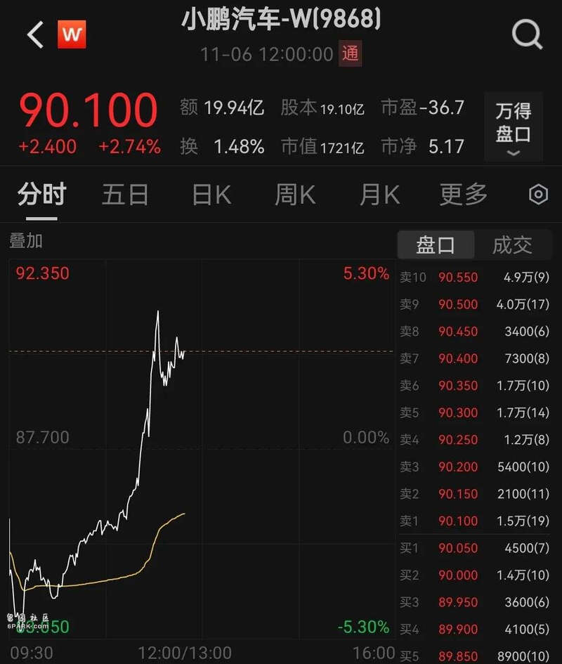 视频发布后,小鹏汽车港股直线拉升。截至发稿,小鹏汽车股价报90.1港元,市值约为1721亿港元,盘中一度跌超5%。