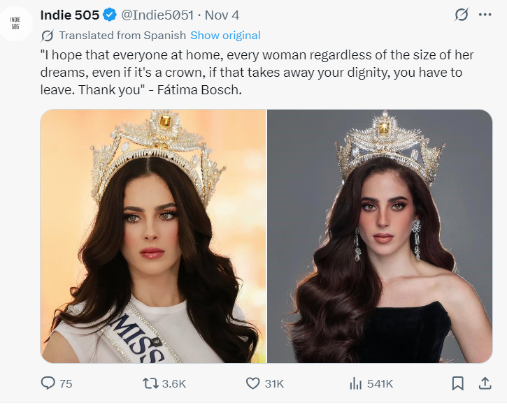 法新社报导,然而,代表墨西哥参赛的波希(Fatima Bosch)4日在赛前活动上遭到泰国赛事总监纳瓦特(Nawat Itsaragrisil)辱骂,身穿晚礼服的她蹬着高跟鞋离开现场。