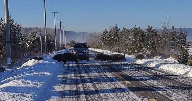 女子偶遇五六十头野猪组团横穿马路 速度比车快