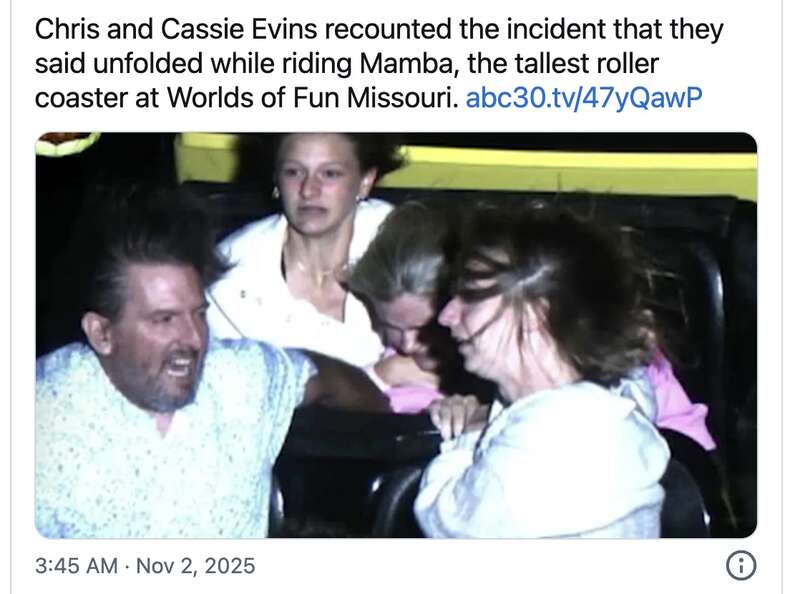 《纽约(专题)邮报》报导,艾文斯回顾当时情况,云霄飞车刚过第一个坡时,坐在他妻子身后的女孩发出前所未有的尖叫声,起初他以为只是没玩过云霄飞车的而高声尖叫,但女孩大喊“我的安全带鬆开了”,让他和妻子毫不犹豫採取行动,伸出援手将身后的女孩固定在座位上,此时云霄飞车速度已达75英里/时(约120公里/时)。