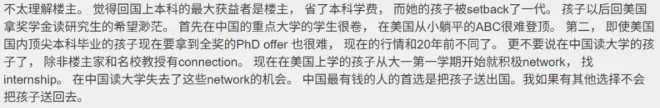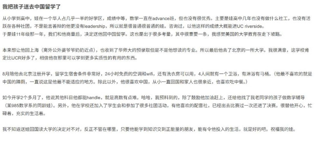 “国内人都想尽办法送孩子来美国读书,你怎么还送回去?”家长的回复我认为对华人家长颇有参考性: