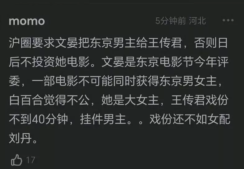 有网友爆料是因为沪圈要求东京电影节评委之一的导演文宴把影帝奖杯给《春树》男主王传君,而同一部电影拿最佳男女主概率极低,白百何因此不满。