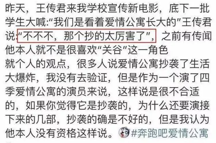 王传君“批评《爱情公寓》抄袭”目前只有网上文字爆料并未有视频流出,真实性其实有待商榷,很可能是将他拒绝继续出演与抄袭事件合在一起了。