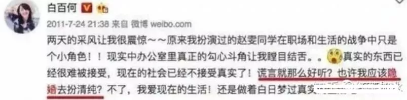 有趣的是,在爆料高露隐婚之前,白百何曾不指名内涵职场内斗,并用了“隐婚去扮清纯”表述,很难不让人怀疑她的爆料不是无心之言。