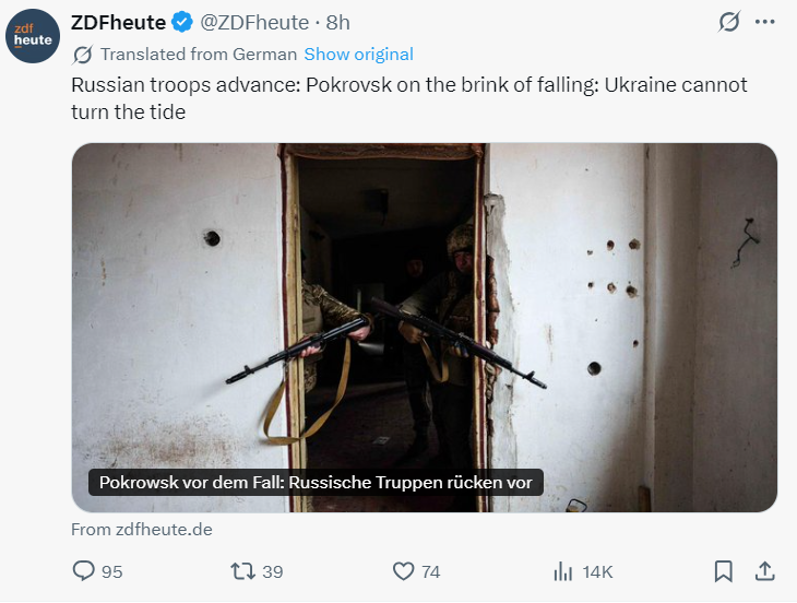 德国媒体ZDF 7日报导,波克罗夫斯克与东面邻近的米尔诺格勒(Mirnograd)战斗已进入关键阶段,俄军连日进一步推进市区,週三(5日)流出的影片显示,俄军部队乘坐军用皮卡大辣辣的进入城内,移除乌军设置的路障,行动过程中几乎未受反击,显示乌军防线已大幅后退。至週四(6日)晚间,俄军已控制约八成市区,只剩北部部分区域仍在乌军手中。