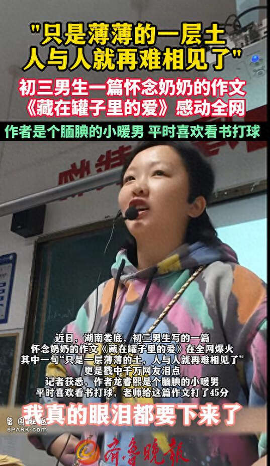 来源:倍可亲(backchina.com)近日,湖南娄底,初三男生写的一篇怀念奶奶的作文《藏在罐子里的爱》短短两天在全网爆火,其中一句“只是一层薄薄的土,人与人就再难相见了”更是戳中千万网友泪点。
