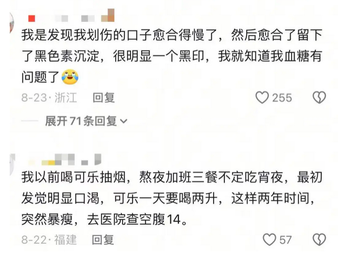 评论区里还有很多病友晒出发现自己患病的征兆:有人是发现身体划伤口子后愈合得慢了,且会留下黑色素沉淀,以此推断血糖有问题……