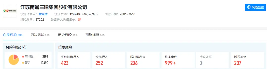 天眼查信息显示,截至目前,南通三建共有422条失信被执行人及237条股权冻结记录,涉限制消费令206条。