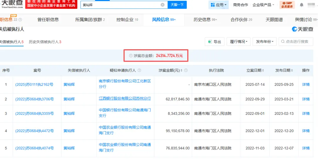 作为南通三建的掌舵人,黄裕辉的个人命运与公司深度绑定。其曾带领南通三建创造辉煌,但随着公司因恒大爆雷陷入信用崩塌困境,黄裕辉本人多次被法院列为失信被执行人。