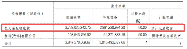 其中,恒大系应收账款高达37.39亿,因预计无法收回,公司计提坏账准备29.91亿元,计提比例高达80%。
