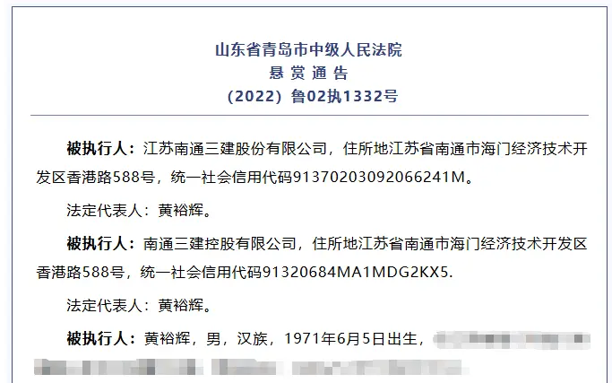 10月11日,青岛中院发布了针对南通三建、三建控股、黄裕辉等多人的悬赏通告,有效期至2026年10月10日。
