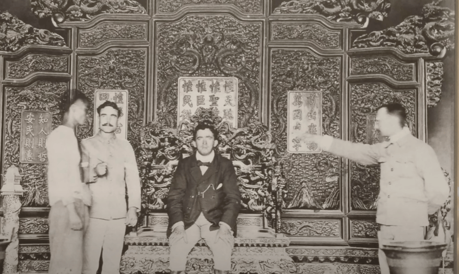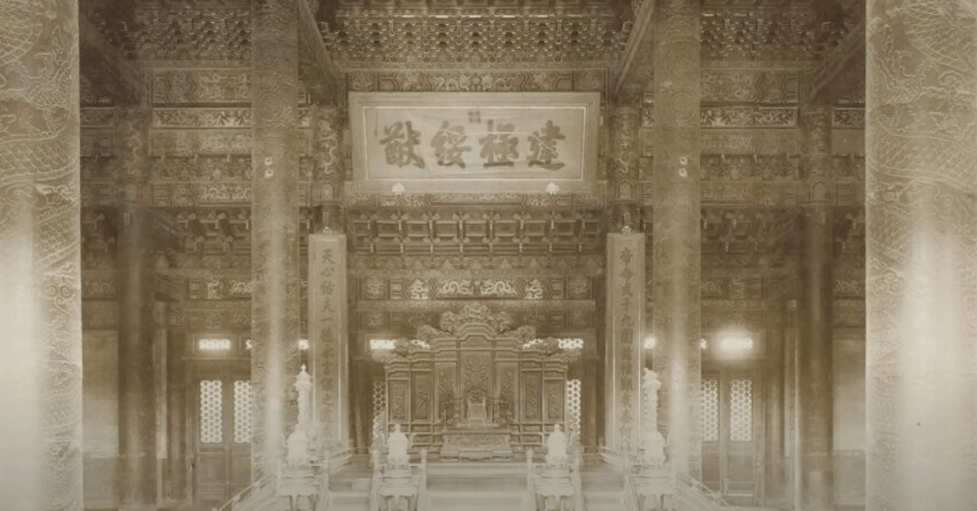 太和殿广场,原本是举行重大典礼的地方,如今变得空荡寂静,只有几个八国联军士兵随意走动。殿内,原本神圣庄严的龙椅上积满了灰尘,曾经富丽堂皇的宫殿,如今变得荒凉破败。龙椅是木质金漆宝座,细节丰富,曾是无数帝王登基的地方。而现在,这座宝座却成了八国联军拍照的背景。曾经高悬的建极绥猷牌匾,象征着乾隆皇帝的御笔,早已不见踪影,只留下复制品。