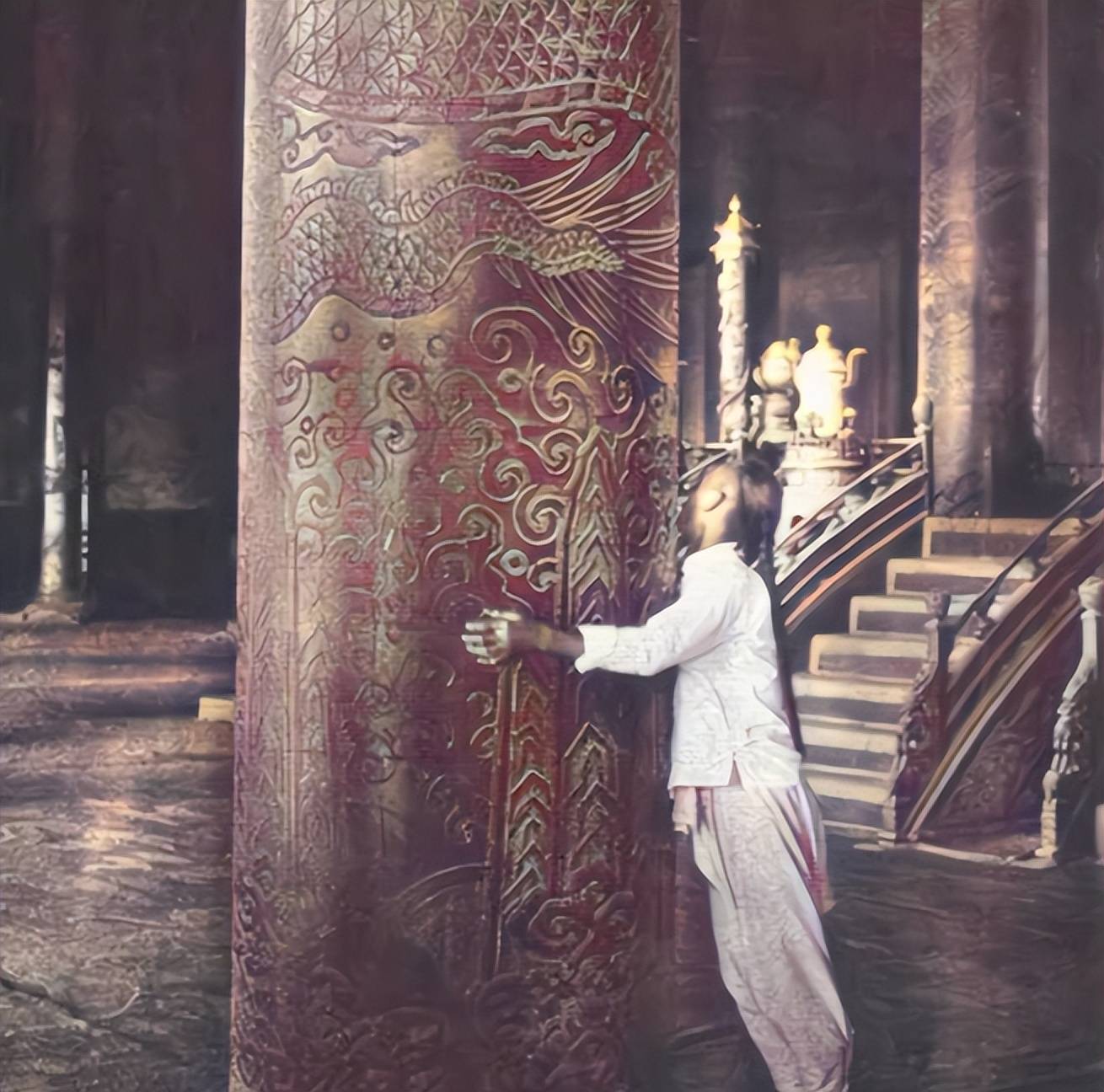 中和殿是皇帝举行大典的地方,在这张照片中,地上竟可见一个太监席地而睡。小川一真特别拍摄了太监抱着金漆盘龙柱的照片,显示了柱子粗壮的体积与金丝楠木上精细的粉彩画,这些细节为我们提供了了解当时故宫建筑艺术的重要线索。