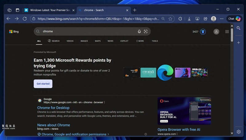 来源:倍可亲(backchina.com)在此之前,微软已经推出过很多次 Edge 浏览器的推广活动,例如在用户搜索“Chrome”关键词时会出现各种 Edge 与 Chrome 的对比,力荐用户转投或留在 Edge 浏览器。Windows Latest 今日报道称,微软又悄悄推出了一项特别的推广活动:当用户在 Bing 上搜索“Chrome”时,系统会弹出提示,称“尝试使用 Edge 浏览器即可获得 1300 个 Microsoft Rewards 积分”。