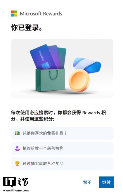 不过,根据用户所处地区不同,微软也会提示不同的内容,例如IT之家刚刚在 Chrome 上搜索得到的弹窗提醒内容是“使用 Microsoft Rewards 扩展,即可通过搜索操作获得礼品卡”。