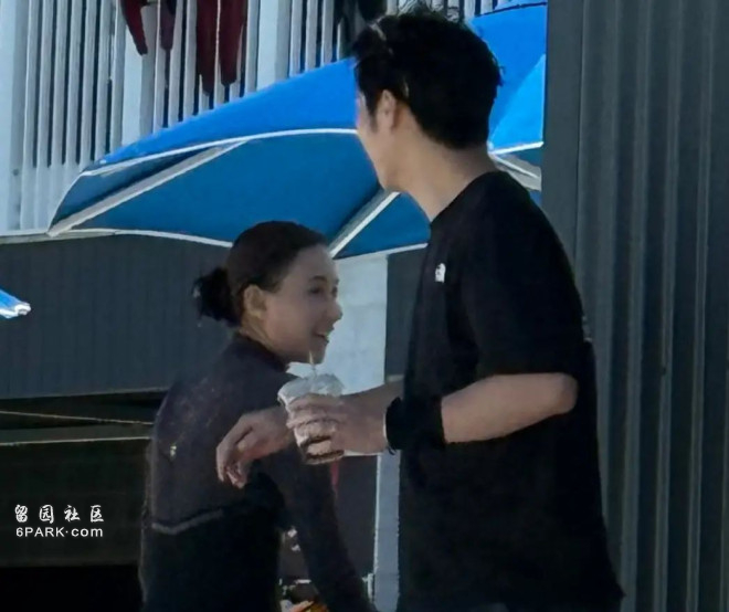 放大两人的表情,能看到何超莲头发全湿,还在滴水,打着赤脚站在地上,想必是刚刚冲完浪上岸。而窦骁则是全身休闲装,黑色T恤搭牛仔裤及白球鞋,看不出任何有下水的倾向,也侧面说明何超莲是一个人冲浪,擅长极限运动的窦骁没有陪她。而两人的交流融洽,看着很自然平常。