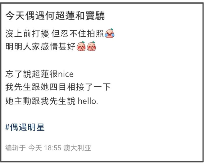 偶遇网友称从现场看夫妻俩感情很好,还强调何超莲人也很好,家人与其目光相接了,她便主动开口打招呼。