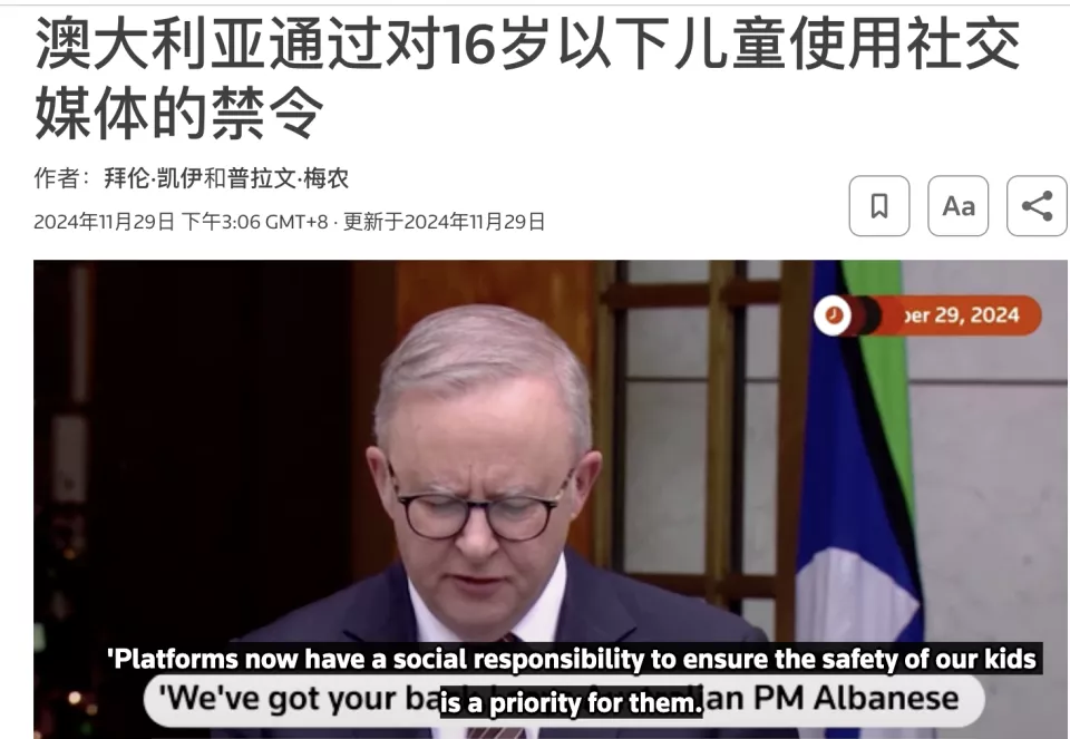 2024年11月28日,澳大利亚议会通过《在线安全法案》修正案,禁止16岁以下未成年人使用包括Facebook、Instagram、TikTok、YouTube和Snapchat在内的社交平台。