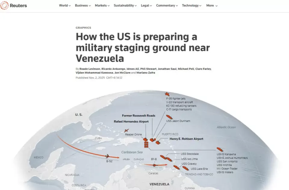 据路透社报道,自8月以来,美军向毗邻委内瑞拉的加勒比海地区不断集结舰艇、军机和兵力,目前“已具备在委境内开展军事行动的条件”。