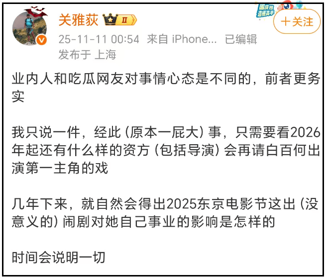 来源:倍可亲(backchina.com)谁能想到,白百何“大闹”东京电影节这件事还有后续!一系列操作翻车后,大家都觉得这件事大结局了,不料白百何好友还在叫嚣,称其“不缺剧本和导演”,马上被业内人士打脸。