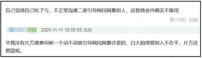 两位虽然都没有明说,但从文中可以明显看出他们的态度——业内人士今后要谨慎启用白百何了。