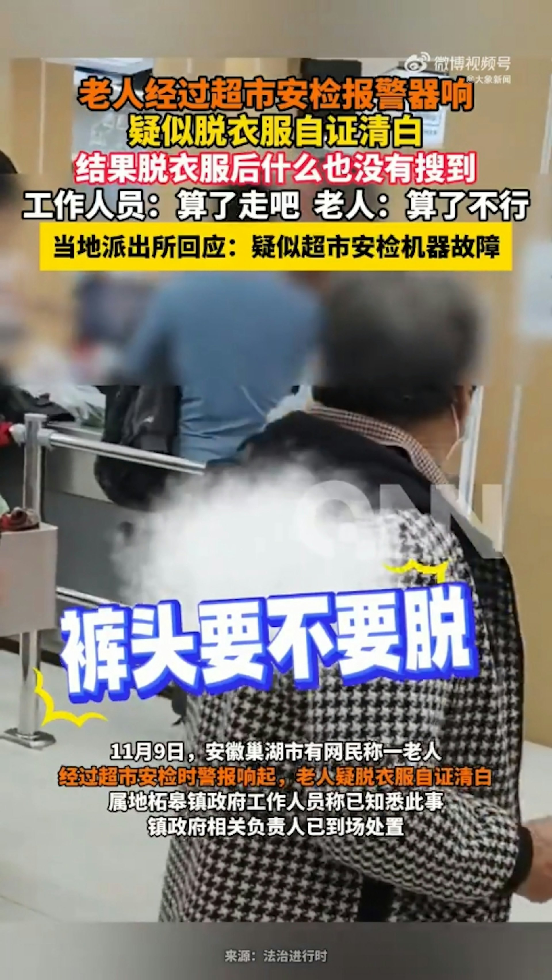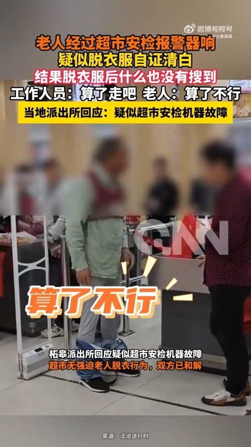 事情發生在11月9日,一位老先生逛完超市後,準備離開時,突然門口警報器發出刺耳聲響。超市的員工立刻攔住他,懷疑他可能攜帶未結帳的商品。老先生當場表示自己身上並沒有任何超市商品,甚至直接開始脫下衣服,想要一清二楚地證明自己清白。然而,超市員工在檢查後發現,老先生確實身上空空如也,並對他說了一句:"算了,您走吧!"