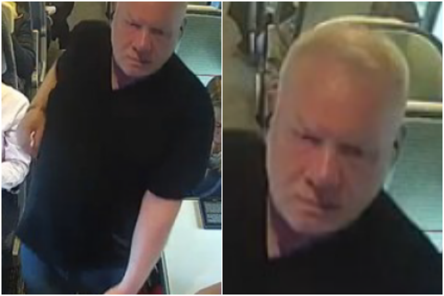 警方释出监视器影像,可见一名年纪稍长的白人男性,身穿黑色短袖上衣、蓝色牛仔裤与白色鞋子,左手拿著手机,正穿过座位中间走道,呼吁认识该名男子的民众提供线索。