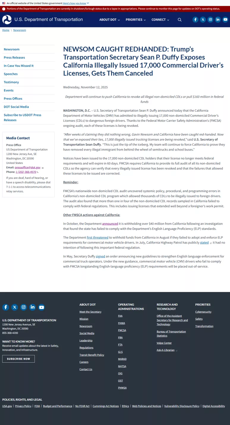 联邦交通部长肖恩·P·达菲(Sean P. Duffy)在一份声明中说,加州机动车辆管理局(DMV)承认非法向17,000名危险的外国驾驶员发放了非加州居民商业驾驶执照(CDL),由于联邦汽车运输安全管理局(FMCSA)正在进行审计,所有这些执照都将被吊销。