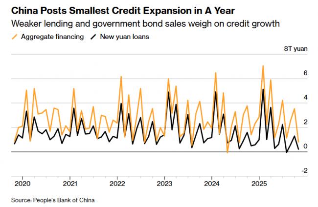 由彭博测算,10 月社会融资规模增量为 8150 亿元人民币(约合 1150 亿美元),为 2024 年 7 月以来最低,也远低于经济学家在彭博调查中预估的1.2 万亿元。