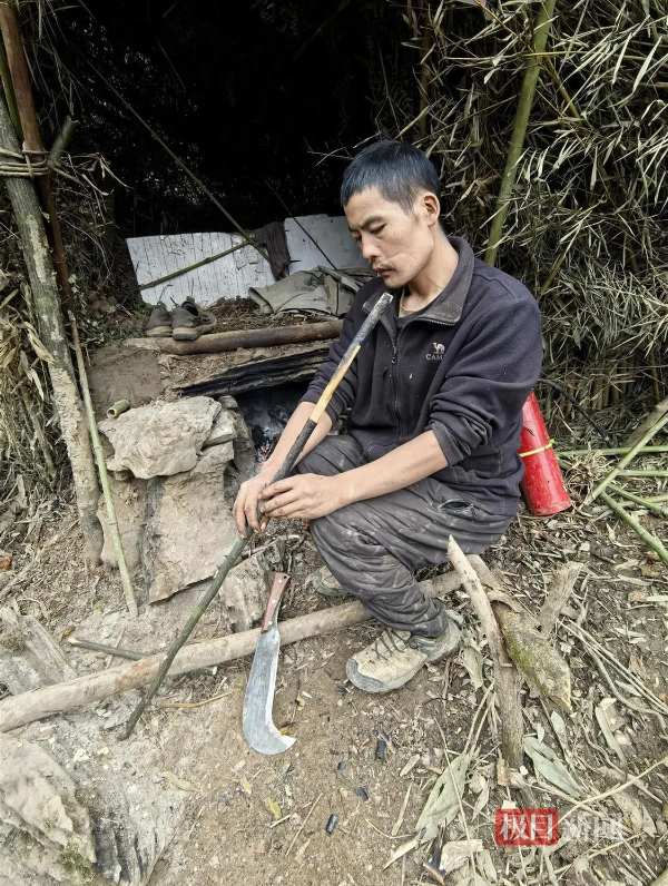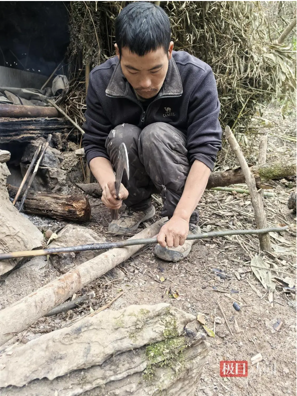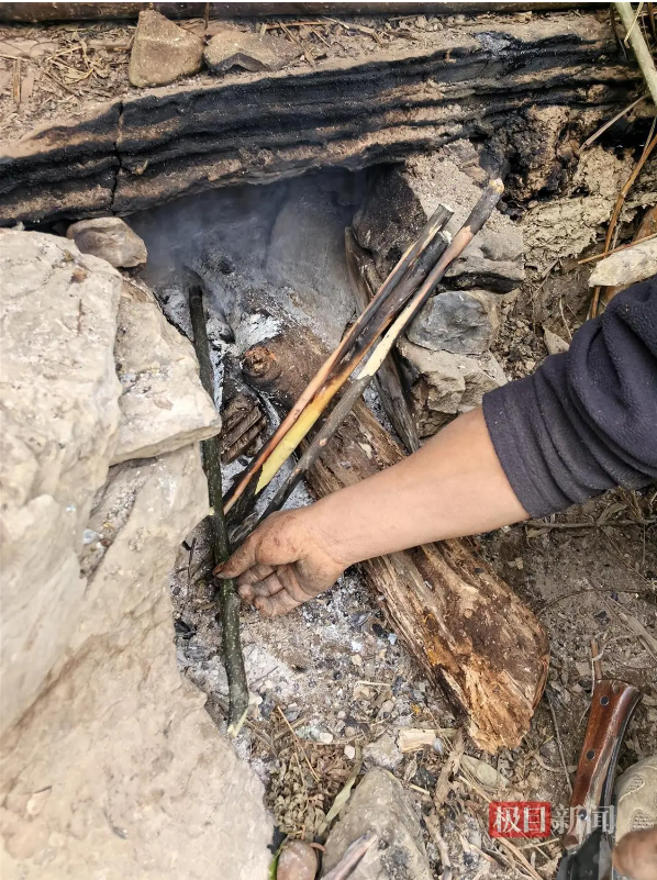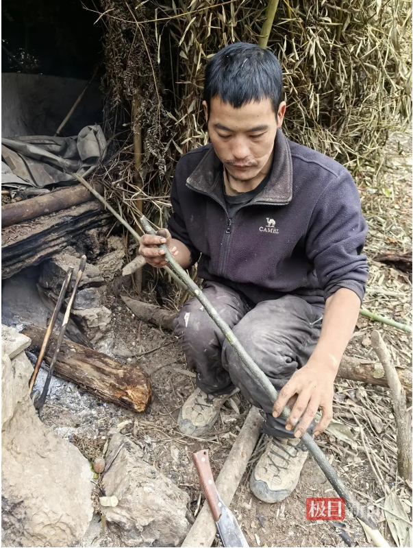 “我这是制作钻木取火使用的木棍,以防止取暖的火不小心灭了后生火用的工具。有一次晚上睡觉后没有注意,等早上起来发现火灭了,烧得啥也没有,就只好重新钻木取火。”“刀疤哥”杨小永告诉极目新闻记者,这是他特意选取的木棍,材质比较好,生火更方便,取一子火大约需要8分钟。