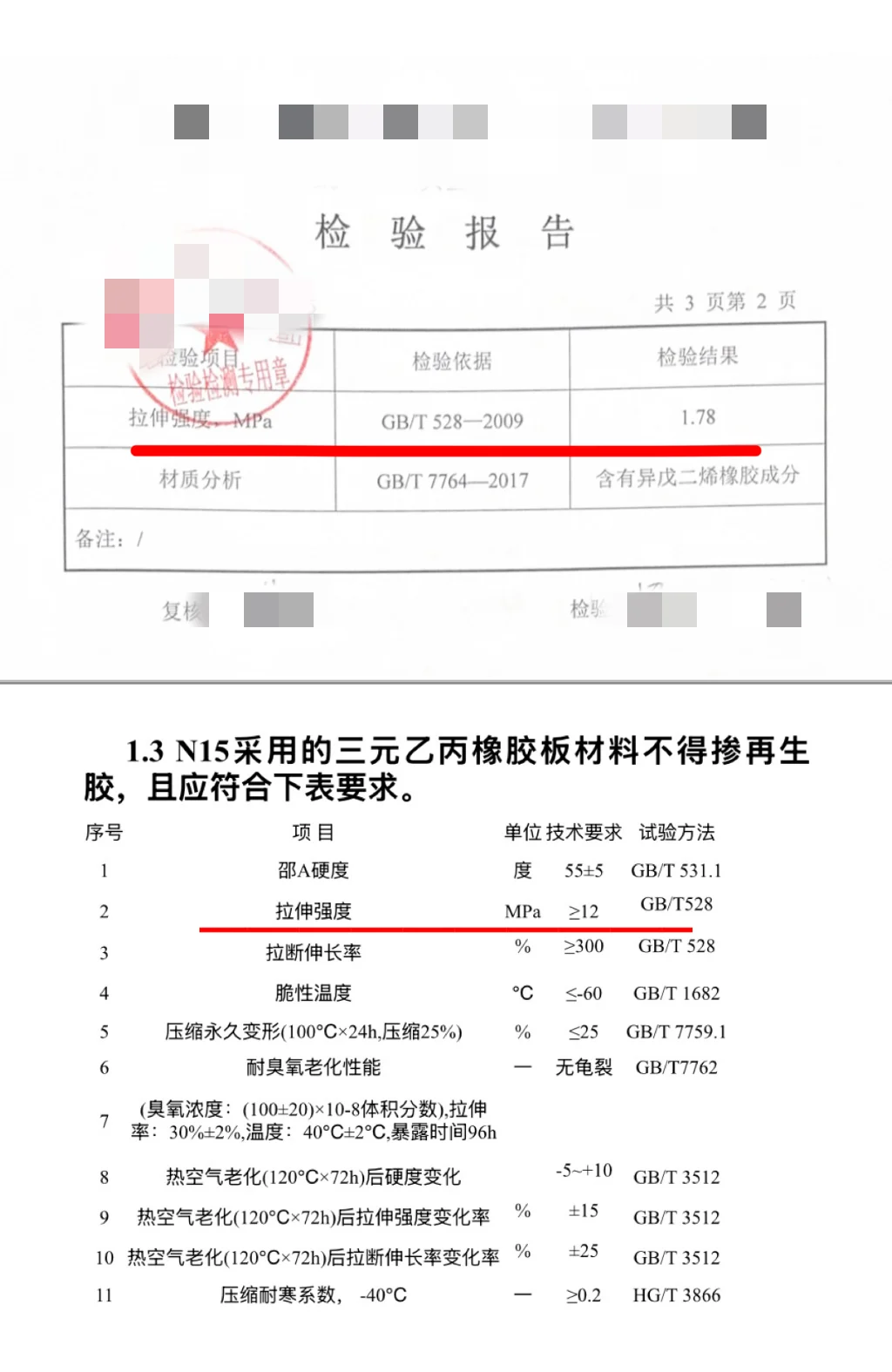 记者随后在一处钢横梁上随机取下一块橡胶板,送往专业橡胶检测机构进行检测。结果显示,送检橡胶板拉伸强度仅为1.78MPa,仅为标准(“≥12MPa”)的15%,而材质分析显示,其主要材料也非三元乙丙橡胶,而是异戊二烯橡胶。