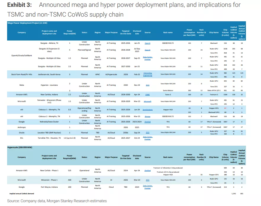 报告分析称,尽管大型科技公司纷纷宣布了庞大的数据中心电力部署计划,但将其转化为对CoWoS的需求后,测算显示台积电及其他厂商的CoWoS产能应足以应对。报告指出,真正的瓶颈在于前端的晶圆制造能力,以及ABF载板和T-Glass(玻璃基板)等其他材料的供应。