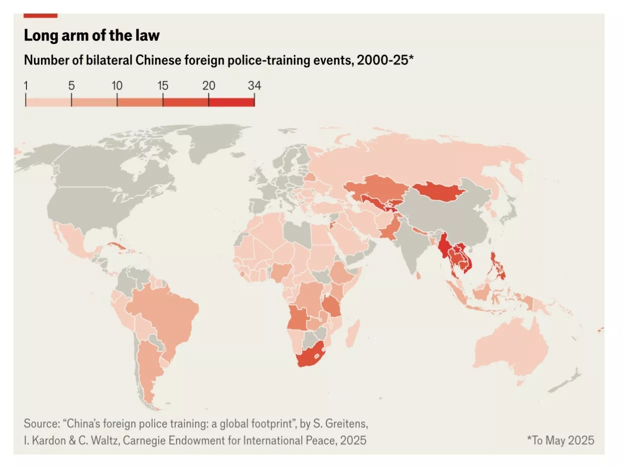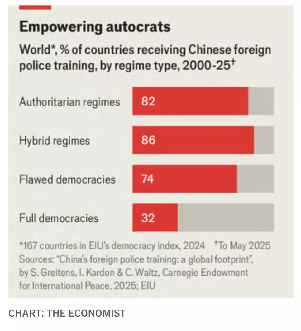 将卡内基的数据与经济学人智库的民主指数交叉比对后发现,全球82%的威权政权接受过中国的警察培训。