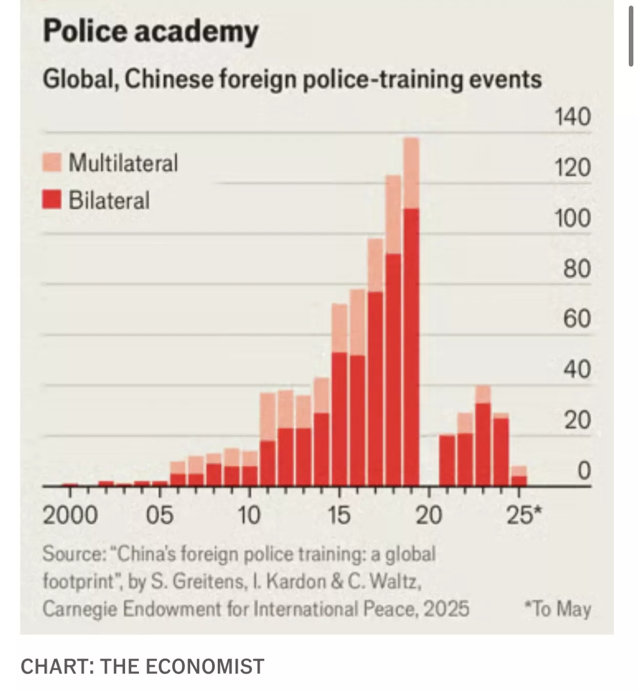 根据格雷滕斯、艾萨克·卡登和卡梅伦·沃尔茨在美国智库卡内基国际和平基金会的一项研究,自2000年以来,中国已为138个国家的警察和内保部队提供了近900场培训。