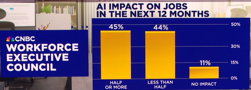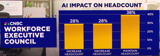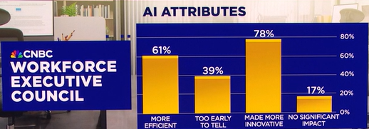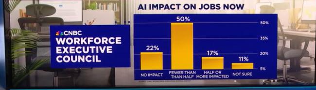 这项面向 CNBC Workforce Executive Council(由美国上市与私企的人力资源负责人组成)的快速调查显示,67% 的受访 HR 高管表示 AI 已经对其公司内部工作岗位产生影响。