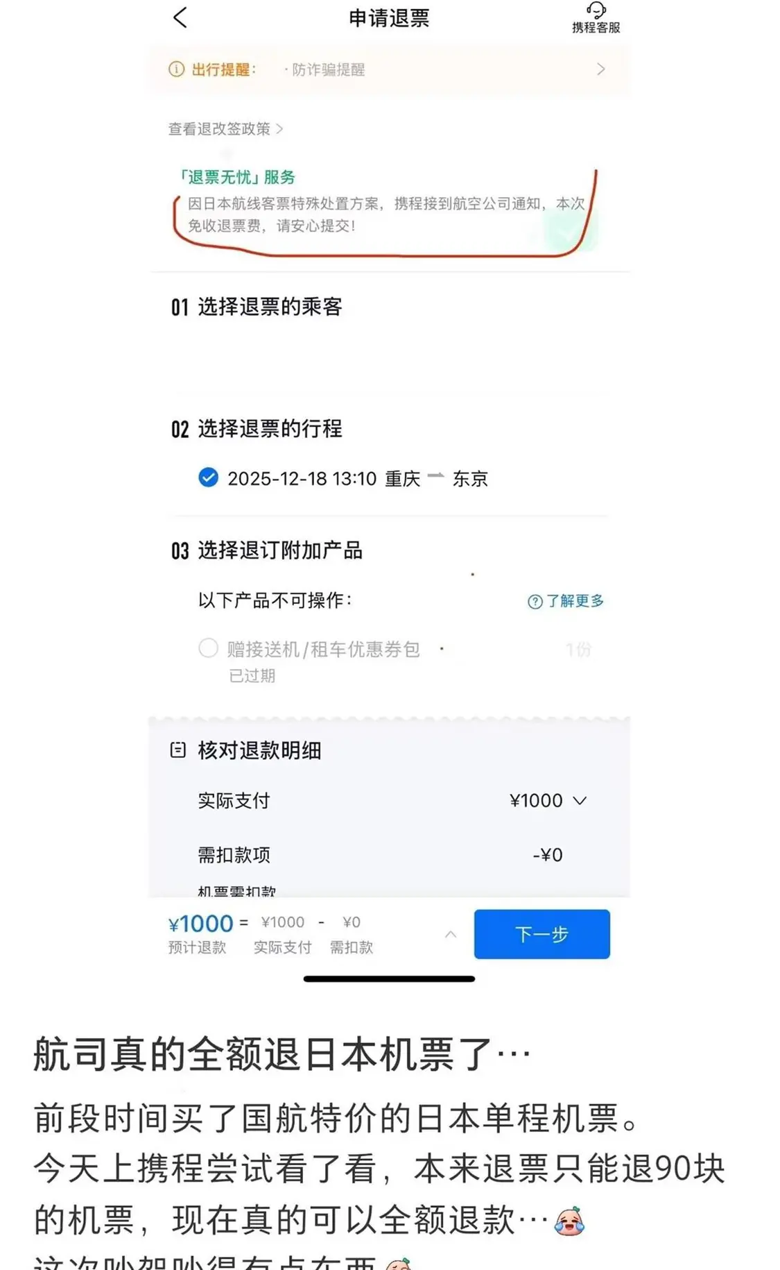 极目新闻记者注意到,多名网友发帖称通过携程平台预订的赴日机票已经退票成功。退款界面显示,因日本航线客票特殊处置方案,携程接到航空公司通知,本次免收退票费。对此,携程平台的客服工作人员回复极目新闻记者称,涉日机票确实有特殊处置方案,但需符合具体的时间和地点规定,并不是所有航司都有免费退改服务,目前只有大陆多家航空公司有特殊处理政策。