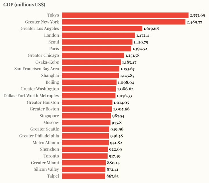 但是亚洲还是非常亮眼。该杂志称,亚洲在2025年排名中的主导地位反映了全球经济重心的广泛转变。韩国首尔排名第5,凸显了韩国在科技、电子和数位创新方面的进步。大坂-神户以1.185兆美元GDP名列第8。