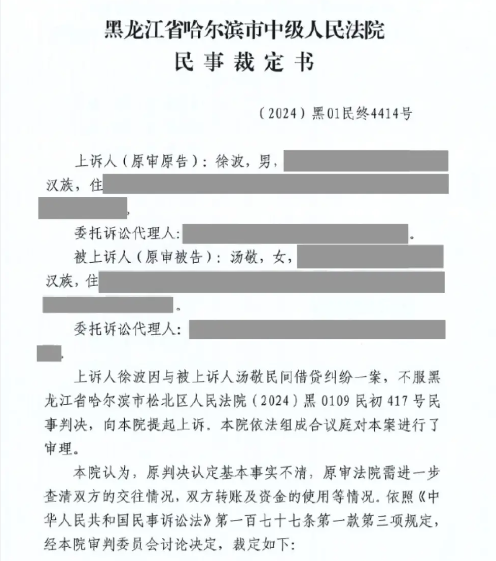 黑龙江省哈尔滨市中级人民法院出具民事裁定书指出:原判决认定基本事实不清,原审法院需进一步查清双方的交往情况,双方转账及资金使用等情况。