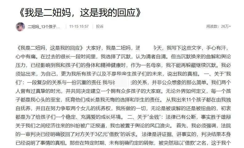 对于两人的关系,该文字写道,并非公众想象的那么简单。两个人曾有过真挚的时光,并共同决定建立一个拥有众多孩子的大家庭。该文称,过去十几年,为了维系多个孩子的大家庭,开销是巨大且持续的。所接收的款项,绝大部分都用于共同生活期间的开支。