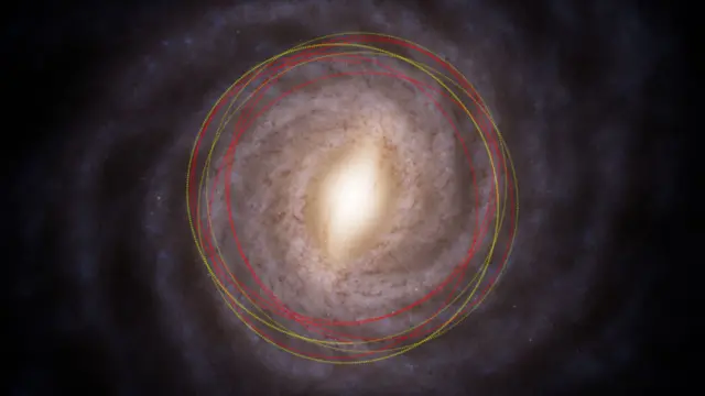 图像来源,M HOPKINS/ŌTAUTAHI-OXFORD TEAM; BASE MAP: ESA/GAIA/DPAC, S PAYNE-WARDENAAR图像加注文字,3I/亚特拉斯彗星(红色轨迹)正环绕银河系中心运行,就如同我们的太阳(黄色轨迹)一样。