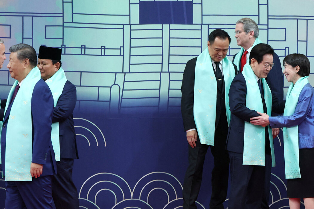 本月在韩国庆州举行的亚太经合组织峰会上,日本首相高市早苗(最右)与韩国总统李在明握手。中国国家主席习近平站在最左侧。 YONHAP NEWS AGENCY, VIA REUTERS