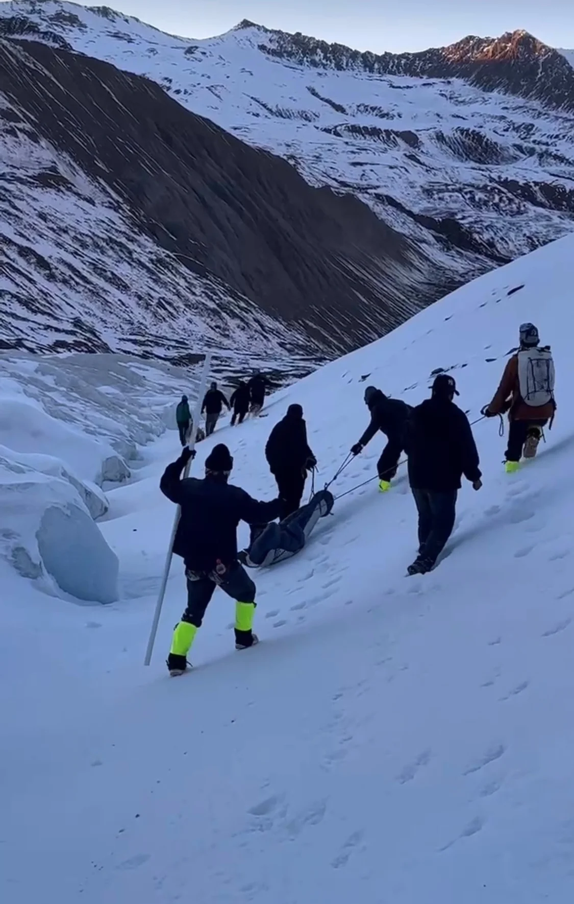 后来,救援队赶到了山上。因为地形复杂,岩石与冰川交错,救援队无法用担架,他们把朱鹏的搭档抬到睡袋上,利用雪地的优势往山下拖着走,遇到障碍物就抬起。两个多小时后,朱鹏在帐篷里见到了搭档,“我们俩相视一笑,因为都活过来了”。