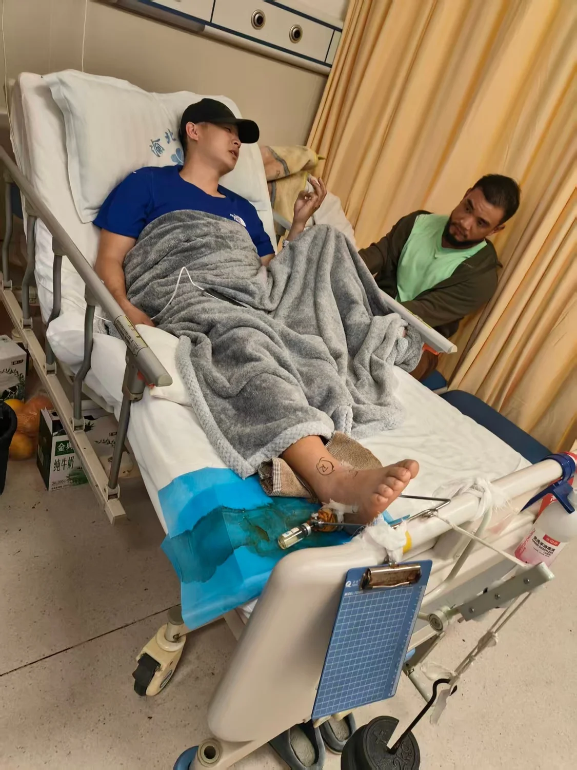 近日,朱鹏从四川转至家乡重庆的医院,搭档则还在四川的医院。经检查,朱鹏的右脚腓骨断裂,医生用电钻把螺钉打进脚踝处暂时固定,并进行牵引拉直,后续还需做手术。朱鹏每天都要打镇痛针,他和搭档在手机上交流,两人的共同感受就是疼。